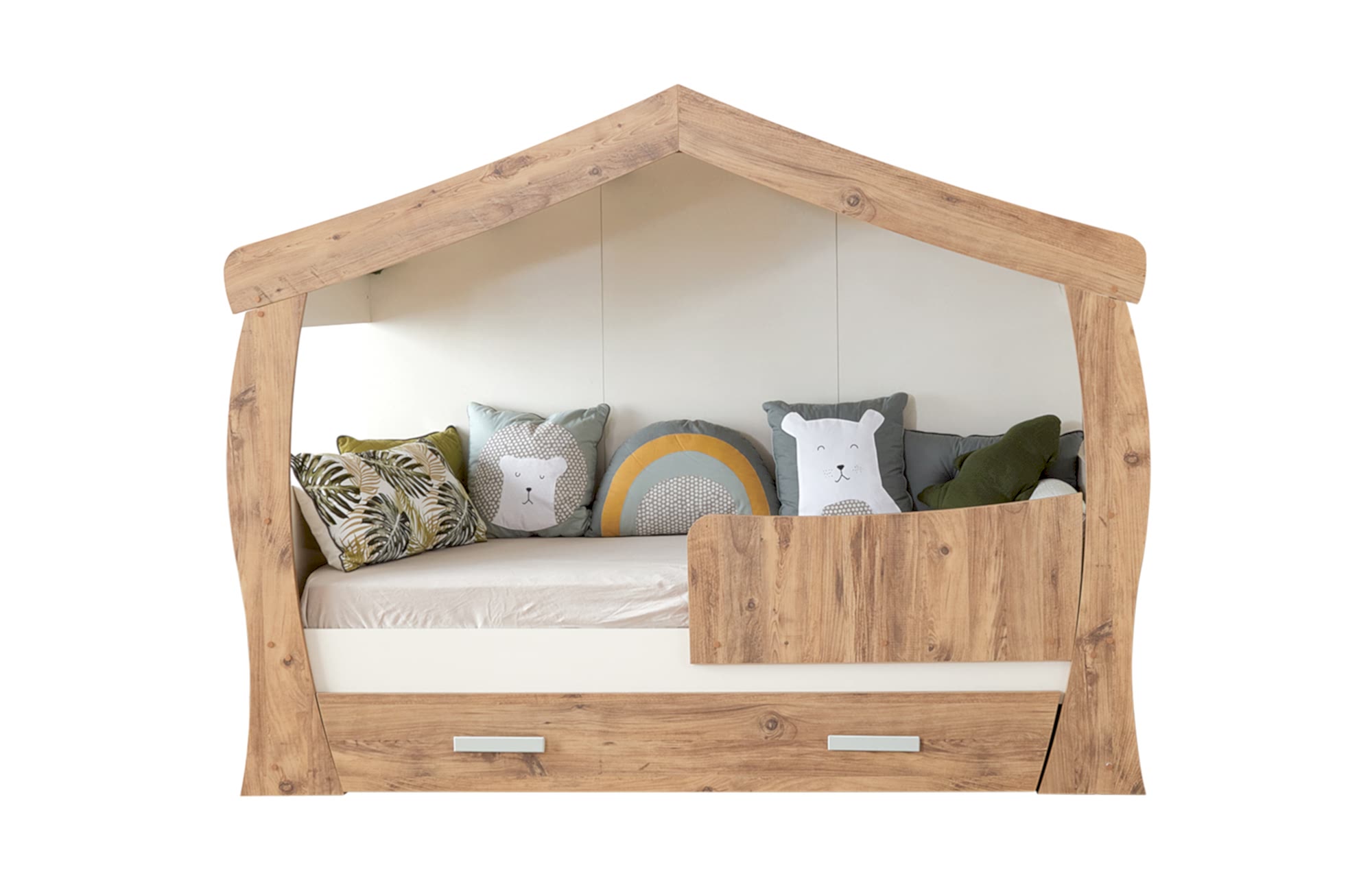 E1 kalitesinde üretilen 18 mm kalınlığında beyaz renk melamin kaplı yonga levha; EN 71-3 sertifikalı boyalarla tamamlanan el işi ahşap parçalarla buluştu. PVC kenar bantları hem estetik görünüm sağlıyor hem de güvenli bir dokunuş sunuyor.
